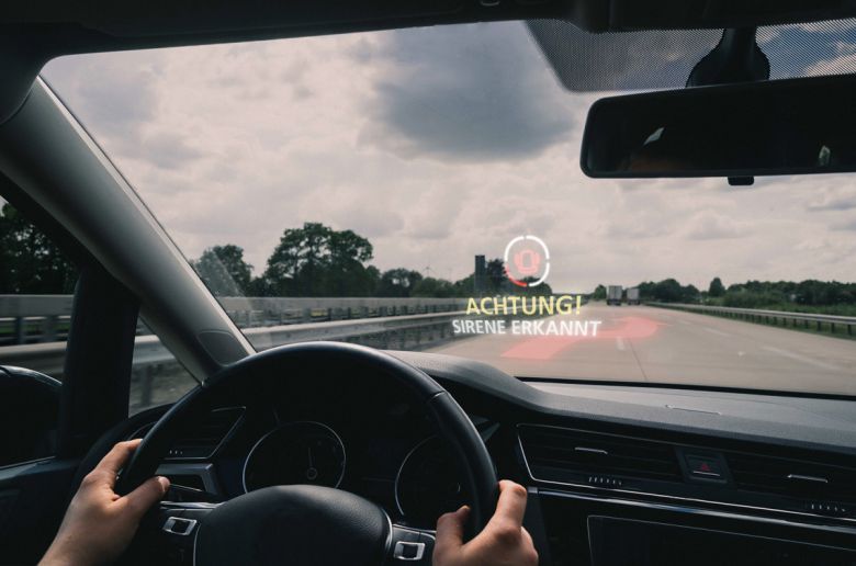 독일 프라운호퍼 디지털 미디어 기술 연구소(프라운호퍼 IDMT)가 개발한 기술이 적용된 자동차 앞유리에 ‘사이렌 소리 감지’라는 메시지가 떠 있다. 프라운호퍼 IDMT 제공 |