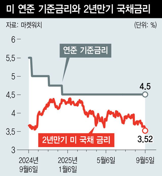 이에 연준의 기준금리 인하 속도가 빨라질 것이라는 전망이 확산됐다. 기준금리의 영향이 큰 2년만기 미 국채금리는 이날 0.08%포인트 떨어져 연 3.52%로 내려갔다. 이는 현 기준금리 상단인 4.5%에 견줘 1.0%포인트 가량 낮다. 연준이 기준금리를 1.25%포인트 가량 내리는 것을 선반영하고 있는 셈이다.