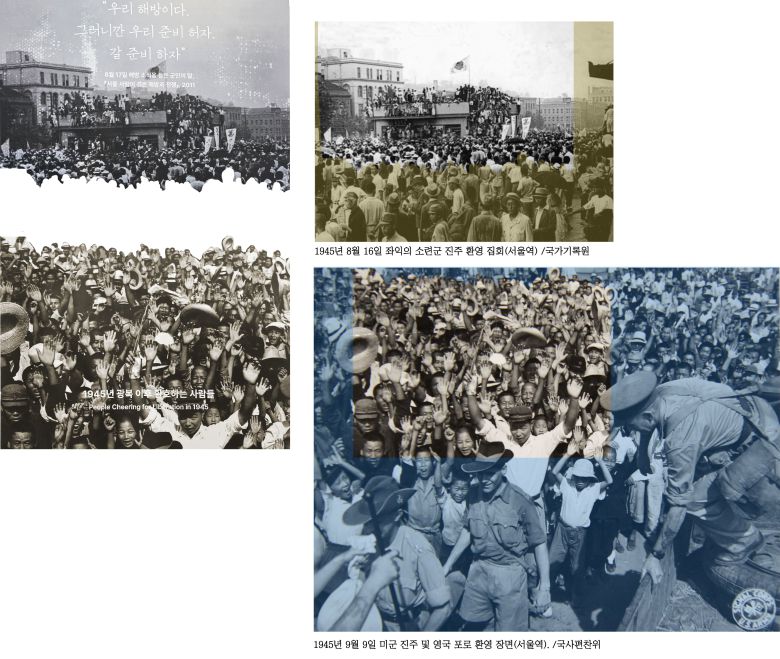 그런데 이 사진은 조작이다. 1945년 9월 9일 미군 진주와 함께 용산 포로수용소에서 석방된 영국군을 환영하는 사진과 해방 다음 날인 1945년 8월 16일 소련군이 진주한다는 소문에 서울역으로 몰려든 좌익 계열 집회 사진을 교묘하게 이어 붙였다.