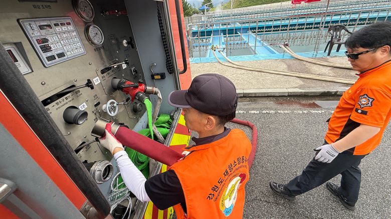 이들은 주 임무는 정수장에 도착한 소방차에 호스를 결합하고, 물이 원활하게 분사될 수 있도록 호스를 정리하고, 급수에 이상이 없는지 지켜보는 일입니다.