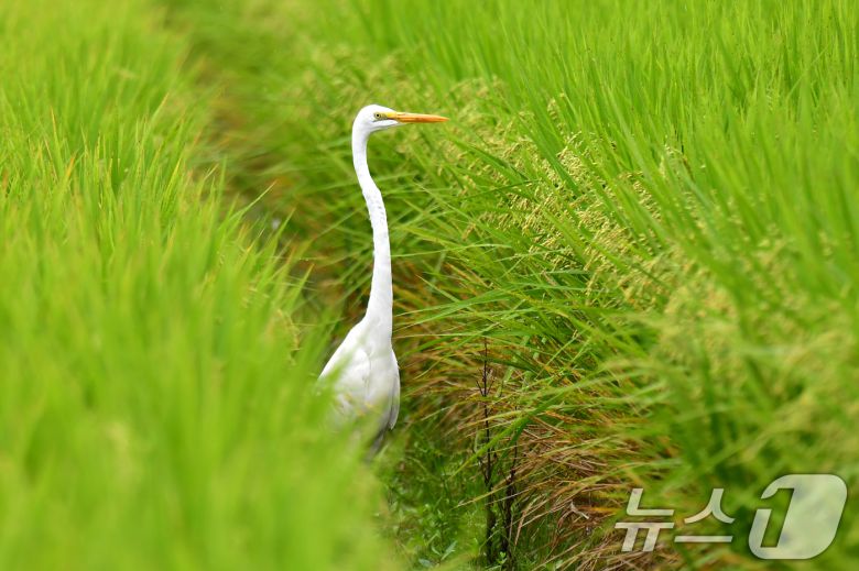 절기상 백로인 7일 경북 포항시 북구 흥해읍 들녘에서 대백로 한마리가 먹잇감을 찾아 다니고 있다. 2025.9.7/뉴스1 ⓒ News1 최창호 기자 |