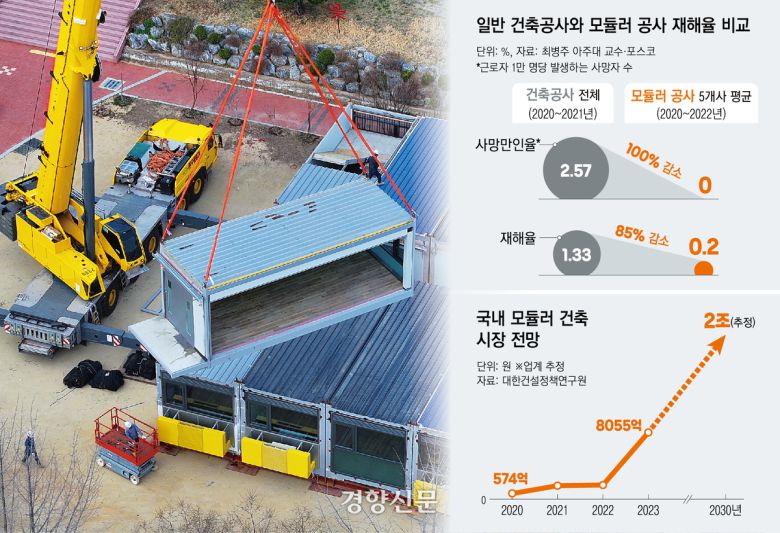 국토교통부도 2023년 탈현장 공법 활성화를 위해 2030년까지 연간 3000호의 공공발주를 추진하겠다고 밝힌 바 있고, LH는 올해 1000가구, 내년부터 2029년까지 매년 3000가구, 2030년 이후엔 매년 5000가구 규모 모듈러 주택 발주를 계획하고 있다. 건설업계에서는 2023년 8055억원 수준이던 국내 모듈러 건축 시장이 2030년 2조원까지 성장할 것이라는 전망도 나온다.