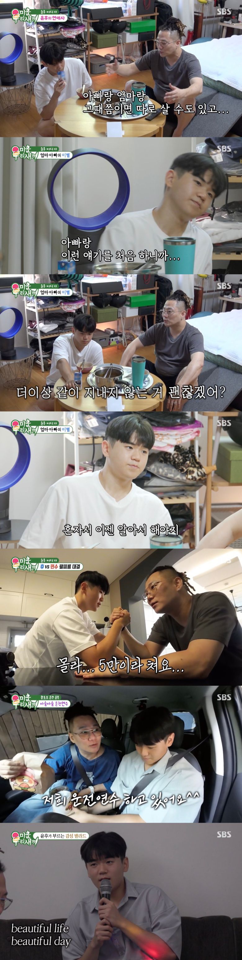 식사를 하던 중 윤민수는 곧 다시 미국으로 떠나는 아들을 아쉬워했다. 그리고 그는 "다음에 한국에 올 땐 엄마랑 아빠랑 어떻게 될지 몰라, 따로 살 수도 있어. 그땐 지금처럼 계속 같이 못 있는다"라며 "네가 엄마네 갈지 아빠네 올지 모르니까"라고 말했다.