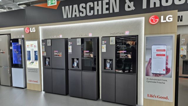 냉장고 코너 쪽, 소비자 시선이 꽂히는 벽면 전시된 LG전자 전략 모델들 역시 에너지 효율이 주무기였다. 문을 노크하면 내부가 보이는 인스타뷰 냉장고 3대 중 가장 왼쪽에 있는 양문형 제품은 독일의 권위 있는 소비자 매체 스티프퉁 바렌테스트로부터 최고 제품으로 선정됐다. 출시 당시 A -20% 등급으로 업계 최고 에너지 효율을 자랑한 제품이다. 이 제품을 포함해 총 세대의 냉장고가 올해 8월 이 매체로부터 최고 제품으로 꼽혔다. 회사는 이보다 에너지 효율을 개선한 A -40% 등급의 신제품을 곧 출시한다.