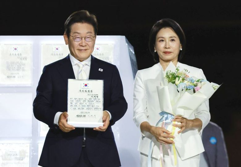 지난 6월4일, 서울 여의도 국회에서 열린 대통령 취임식에서 손을 들어보이고 있는 이재명 대통령과 김혜경 여사 ⓒ국회사진기자단 |