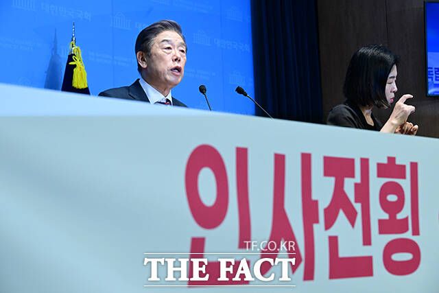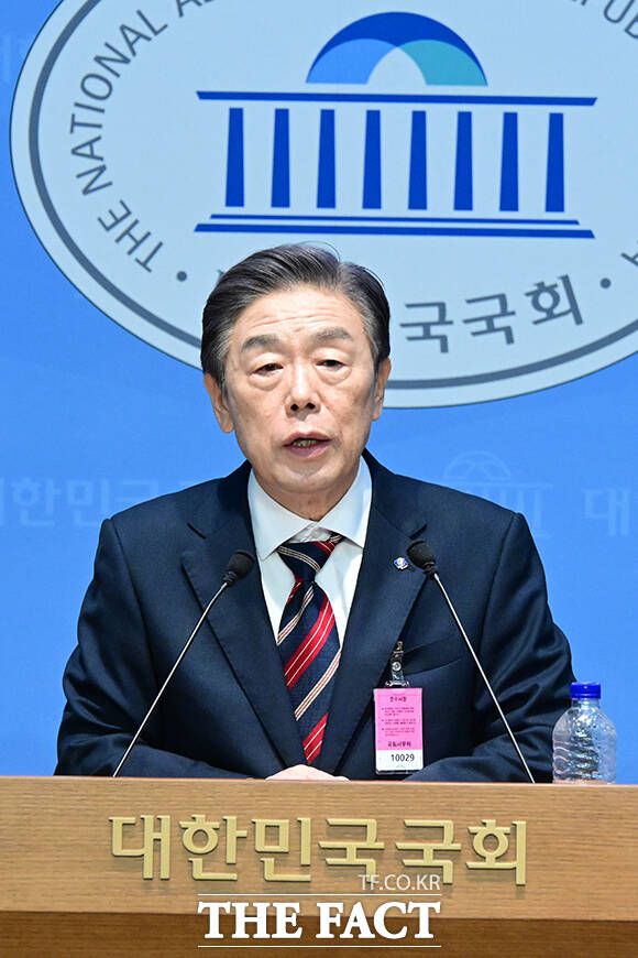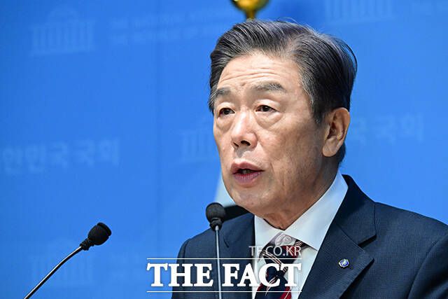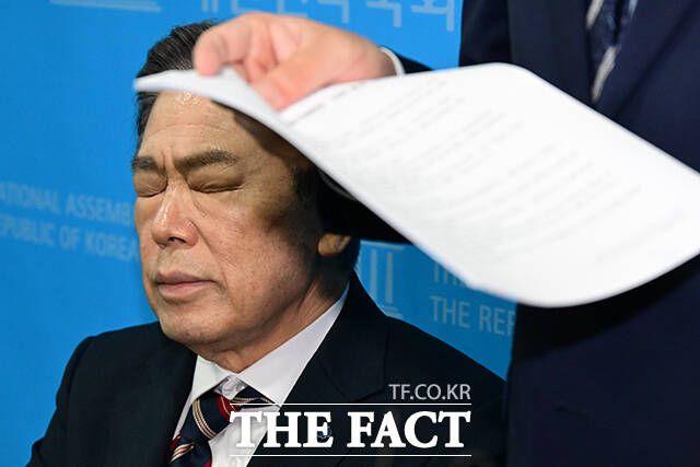 [더팩트ㅣ국회=남윤호 기자] 김형석 독립기념관장이 8일 서울 여의도 국회 소통관에서 기자회견장으로 이동하던 중 사퇴를 촉구하는 시민단체 회원들에게 항의를 받고 있다.