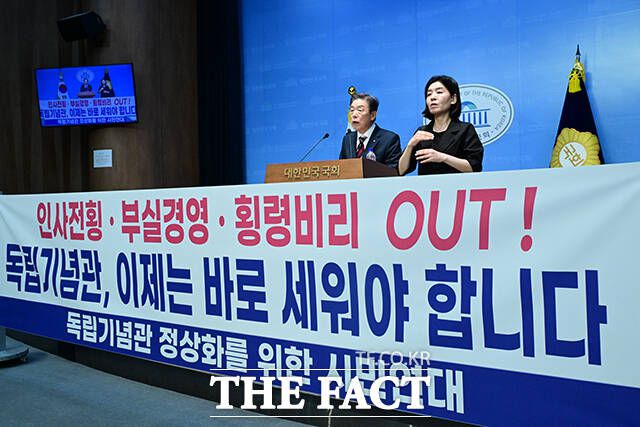 이날 김형석 관장은 자신과 관련된 논란에 대해 기자회견을 열고 입장을 밝힐 예정이었다. 김 관장이 기자회견장으로 이동하는 과정에서 그의 사퇴를 촉구하는 시민단체 회원들이 거세게 항의했다.