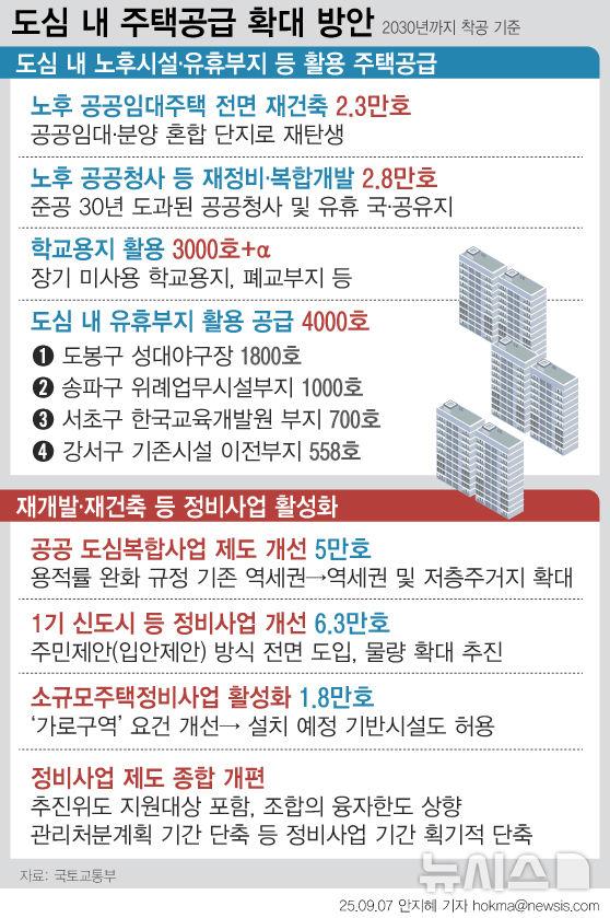 [서울=뉴시스] 정부가 서울의 준공 30년 이상 노후 영구임대 등 공공임대주택을 추가 용적률을 최대 500%까지 확보하는 고밀 개발 방식으로 재건축해 2030년까지 수도권에 2만3000호를, 노후 공공청사·국유지 재정비로 2만8000호를 착공한다. 도심 내 학교, 미사용 학교 용지, 폐교 부지에 공공주택과 교육시설, 생활SOC를 복합개발해 2030년까지 수도권에 '3000호+α'를 착공한다. 재건축·재개발 등 정비사업 활성화도 추진한다. (그래픽=안지혜 기자)  hokma@newsis.com