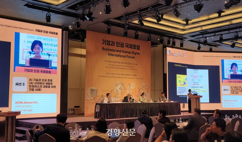 법무부와 국가인권위원회가 8일 서울 중구 앰배서더 풀만 호텔에서 <기업과인권 국제포럼>을 개최했다. 하진화 카카오 AI 안정성 선임 매니저가 ‘AI 기술과 인권 존중’을 주제로 발표를 이어가고 있다. 백민정 기자