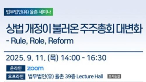 한편, 율촌은 오는 11일 주주총회 실무에 정통한 전문가들과 함께 '상법 개정이 불러온 주주총회 대변화 ? Rule, Role, Reform' 세미나를 개최한다.