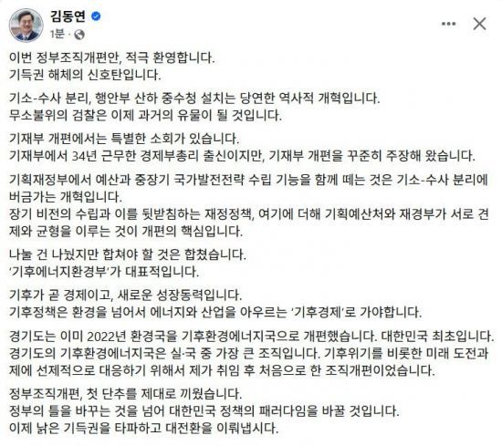 김동연 지사는 이날 자신의 사회관계망서비스(SNS)에 올린 글에서 "이번 정부 조직개편안, 적극 환영하다"며 "기득권 해체의 신호탄"이라고 평가했다.