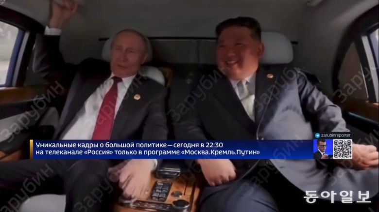 러시아 국영방송 전러시아 국립 TV·라디오 방송사(VGTRK) 소속 파벨 자루빈 기자는 8일 자신의 텔레그램에 두 정상이 푸틴 대통령의 전용 리무진 ‘아우루스’ 뒷좌석에 나란히 앉아 대화하고 있는 모습을 영상으로 게시했다. 나란히 열병식을 참관한 뒤 리셉션 오찬 후 북-러 정상회담을 위해 이동하는 모습이다.