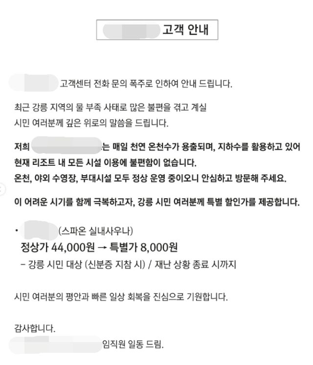최근 해당 리조트는 홈페이지에 ‘강릉 물 부족 사태 관련 고객 안내’라는 제목의 공지를 띄우고 온천 사우나 입장료를 강릉 시민에 한해 정상가 4만4000원에서 8000원으로 할인한다고 밝혔다. 신분증을 지참한 강릉 시민이면 누구나 이용 가능하며, 할인은 재난 상황 종료 시까지 이어진다.