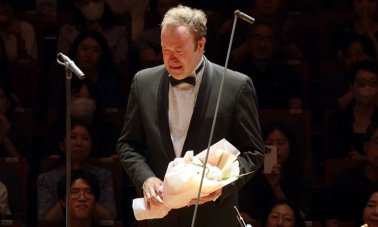 서울 서초동 예술의전당 콘서트홀에서 5일 열린 국립심포니 제258회 정기연주회에서 임기를 마친 예술감독 다비트 라일란트를 위해 단원들이 ‘올드 랭 사인’을 연주하자 라일란트가 눈물 흘리고 있다. 국립심포니 인스타그램 |