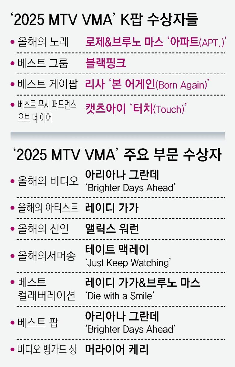MTV VMA는 그래미 어워즈, 아메리칸 뮤직 어워즈(AMA), 빌보드 뮤직 어워즈(BBMA)와 함께 미 대중음악을 대표하는 4대 시상식 중 하나다. ‘올해의 노래’를 K팝 가수가 받은 건 처음으로, 2021년 방탄소년단(BTS)도 ‘다이너마이트(Dynamite)’로 후보에 올랐지만 수상에 이르진 못했다. 임희윤 대중문화평론가는 “VMA는 철저히 미국적인 시상식”이라며 “로제의 ‘올해의 노래’ 수상은 현지에서의 인기가 얼마나 큰지를 보여준다”고 평했다.