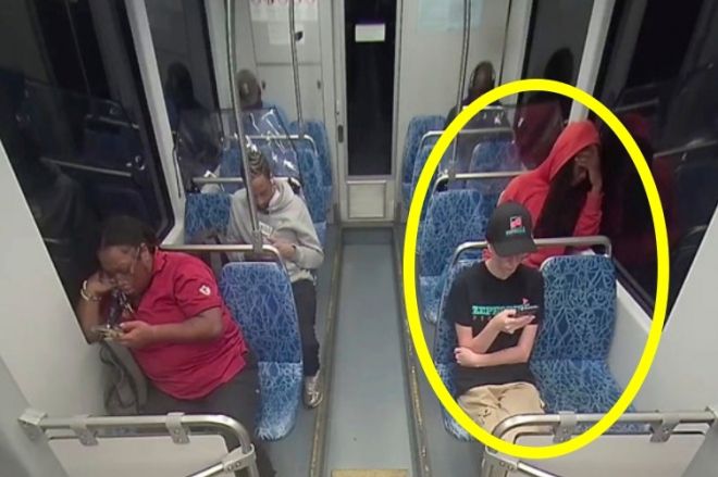지난달 22일(현지시간) 미국 노스캐롤라이나주 샬럿의 경전철에서 살해된 우크라이나 난민 이리나 자루츠카(오른쪽 아래)의 사건 직전 모습. AP 연합뉴스 |