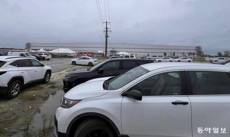 8일(현지 시간) 미국 조지아주 엘라벨의 현대자동차-LG에너지솔루션 합작 배터리 공장(HL-GA) 임시 주차장. 건설 현장에 투입된 한국인 근로자들이 이용한 것으로 보이는 차량들이 주차돼 있다. 4일 미 이민당국의 불법 체류자 단속으로 한국인 300여 명이 불시에 체포되면서 빈 차들이 주차장에 방치돼 있었다. 엘라벨=임우선 특파원 imsun@donga.com