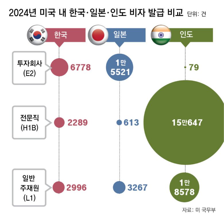 이는 E2 비자는 일본이, H1B 및 L1 비자는 인도가 쓸어갔기 때문이다. 일본인이 E2로 받은 비자는 1만5521건으로 한국인의 2배 이상이었다. E2 전체(5만5324건)의 28%를 차지했다. 인도인은 H1B에서 전체 21만9659건 중 69%인 15만647건을, L1에서 7만1799건 중 26%인 1만8578건을 발급받았다. E2, H1B, L1 등 세 가지 비자를 합치면 인도가 한국의 14배 규모다. 이는 일본이 미국의 핵심 외국인직접투자(FDI)국이고 인도인 고학력 인재들이 실리콘밸리 등 미국 정보기술(IT) 산업에서 활발하게 활동한 결과로 풀이된다.