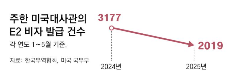 한국인들이 미국 비자 발급에서 불이익을 받는 상황은 올해도 이어지고 있다. 한국무역협회가 올 5월까지 주한 미국대사관이 발급한 E2 비자 발급 건수를 조사한 결과 전체 2019건에 그쳤다. 이 수치는 지난해 같은 기간(3177건) 대비 36.5% 줄어든 것이다. 무역협회는 “한미 관세 협상에 따라 한국의 대미 투자는 더욱 확대될 것”이라며 “이에 따라 관리자급 엔지니어 파견 수요가 늘고 있지만 합법적 비자 발급의 구조적 한계에 따라 인력 이동에 애로를 겪고 있다”고 지적했다. 실제로 미국이 비자 심사를 최근 들어 부쩍 강화하면서 체류 목적과 지역을 따진 뒤 한국인의 입국을 거부하는 사례도 늘고 있다. 미 당국은 지난해 말 ESTA 비자로 조지아에 입국한 한국인의 여행 지역이 한국 기업 공장 소재지라는 점에서 그를 취업 목적으로 판단해 본국으로 송환하기도 했다.