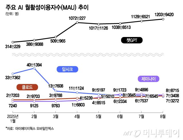 그사이 챗GPT의 이용자는 대폭 늘었다. 1월 314만여명이었던 MAU는 8월 1203만9420명에 달해 7개월 만에 4배 급증하며 국내 시장을 사실상 독식했다. 이달 초 새롭게 출시된 GPT-5에 대한 호불호가 갈리는 상황에서도 8월 MAU 숫자는 전월(1129만6521명) 대비 74만명 증가했다.