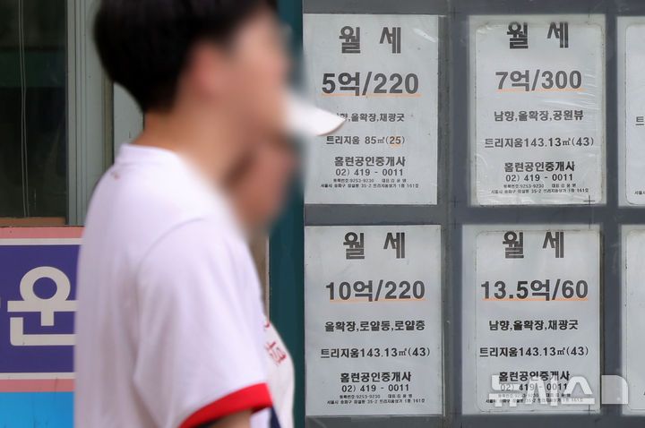 [서울=뉴시스] 홍효식 기자 = 올해 들어 월세 거래량이 지난달 이미 100만건을 넘어섰다.오늘(17일) 대법원 등기정보광장에 따르면 올해 7월까지 전국적으로 확정일자를 받은 주택 임대차 계약 가운데 월세를 낀 계약은 105만6,898건으로 집계됐다.또 올해 전국적으로 월세가 낀 계약 비중은 61.9%를 기록해 처음으로 60%대 진입했다. 서울 월세 비중은 역대 최고인 64.1%에 달하며 월세 시대가 가속화되고 있다.사진은 17일 서울 시내 한 부동산에 게시된 월세 매물 정보. 2025.08.17. yesphoto@newsis.com