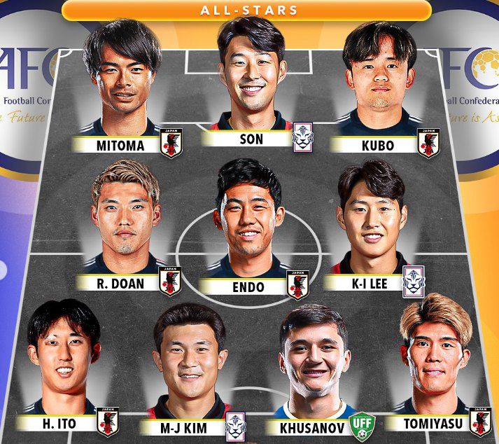 중원엔 도안 리쓰(아인트라흐트 프랑크푸르트), 엔도 와타루(리버풀), 이강인(PSG)이 배치됐고, 최전방 스리톱 라인에 미토마 가오루(브라이턴 앤드 호브 앨비언), 손흥민(LAFC), 구보 다케후사(레알 소시에다드)가 선정됐다.
