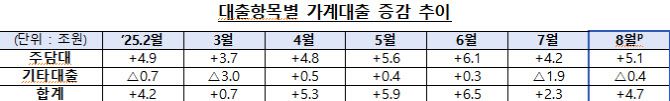 10일 금융위원회와 금융감독원이 발표한 ‘8월중 가계대출 동향’에 따르면, 지난달 기준 가계대출 증가액은 4조7000억원으로 한 달 전(2조3000억원)보다 2조4000억원 늘었다. 주택담보대출(주담대)이 5조1000억원 증가했고, 신용대출 등 기타대출은 4000억원 감소했다. 기타대출 감소 폭은 전달(1조9000억원) 대비 1조5000억원 축소된 것이다. 금융당국 관계자는 “신학기 이사 수요 등 계절적 요인과 8월 이전에 늘어난 주택 거래량이 시차를 두고 금융권 주담대에 반영된 것”이라며 “휴가철 자금 수요 등에 따라 신용대출 감소 폭이 축소된 것도 영향을 미쳤다”고 설명했다.
