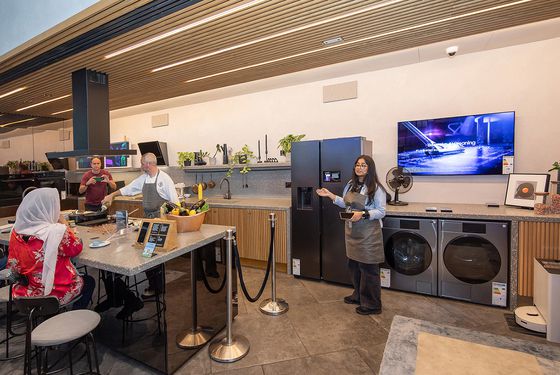 지난 8일(현지시간) 영국 런던에 위치한 삼성전자의 브랜드 전시관 ‘삼성 킹스크로스(삼성 KX)’에서 한 남성이 110인치 마이크로 LED TV 화질을 감상한 뒤 감탄사를 내뱉었다. 그는 곧장 사운드 바를 살펴본 뒤 셰프가 직접 요리를 하고 있는 주방 체험 공간으로 발걸음을 옮겼다.