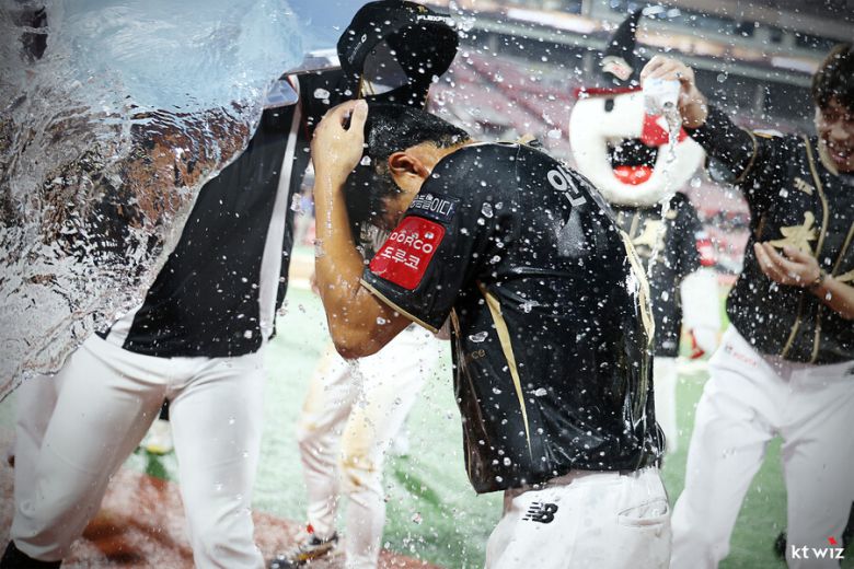 KT 동료들은 안치영의 방송 인터뷰가 끝나자 '물세례'로 격한 축하를 보냈다. 그동안 동료들에게 물을 뿌리는 역할만 했던 안치영으로선 물벼락을 맞아도 그저 기분이 좋을 수밖에.