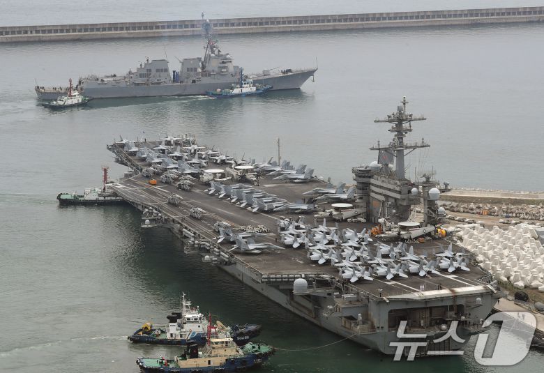 미국 핵추진 항공모함 '시어도어 루스벨트'(CVN-71)과 이지스구축함이 26일 오후 한국·미국·일본 3국의 최초 다영역 군사훈련인 '프리덤 에지'(Freedom Edge)에 참가하기 위해 부산 남구 해군작전사령부 부산작전기지에서 출항하고 있다.2024.6.26/뉴스1 ⓒ News1 윤일지 기자 |