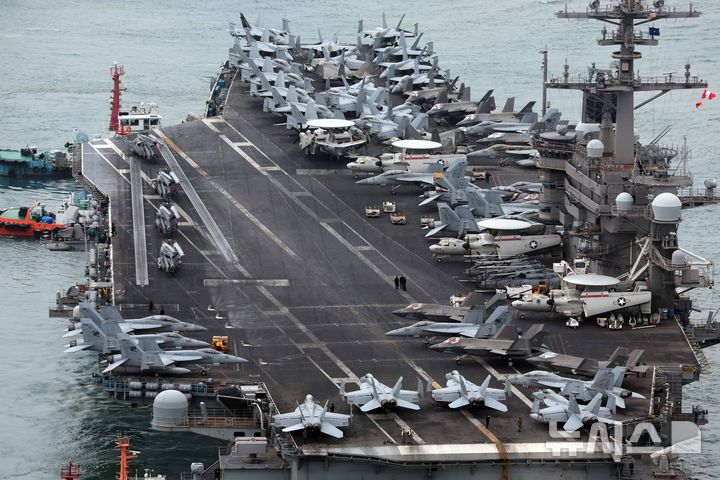 [부산=뉴시스] 하경민 기자 = 미국 해군의 니미츠급(10만t급) 핵추진 항공모함 '칼빈슨함'(CVN-70)이 2일 오후 부산 남구 해군작전사령부 부산작전기지에 입항하고 있다. 2025.03.02. yulnetphoto@newsis.com |