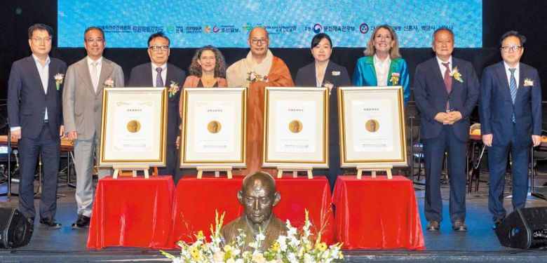 이날 시상식에는 조계종 총무원장 진우 스님, 신흥사 주지 지혜 스님, 여중협 강원도 행정부지사, 김시성 강원도의회 의장, 최상기 인제군수, 이춘만 인제군의회 의장과 행사를 주최한 동국대 윤재웅 총장, 권영민 설악-만해사상실천선양회 이사장 그리고 김종규 한국박물관협회 명예회장, 이근배 전 예술원 회장, 신달자 시인, ‘숲속의 호수’ 한옥을 디자인한 건축가 유병안씨, 퓰리처상을 받은 포토저널리스트 강형원씨 등 문화예술인들과 인제군 주민 등 500여 명이 참석했다. /인제=김한수 기자