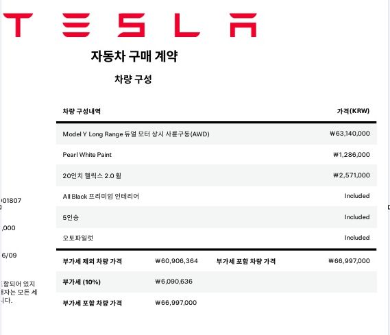 A씨는 실제 테슬라 차량 구매 계약서를 공개하기도 했다. 계약서에는 펄 화이트 외장 컬러 등 옵션이 포함된 차량 가격이 6699만7000원으로 기재돼 있었다.