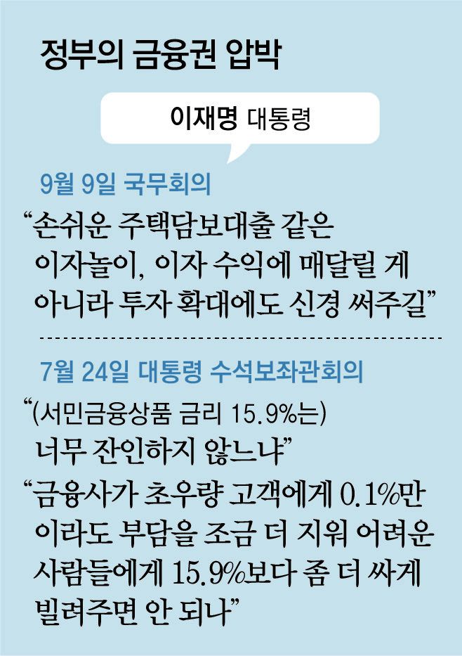 정부가 이 대통령의 공약인 서민금융안정기금 조성 방안을 구체화할 것이라는 전망도 나온다. 금융권은 이미 취약계층 채무 탕감을 위한 배드뱅크 재원 4000억 원, 교육세율 인상으로 인한 1조3000억 원의 추가 세금 부담, 국민성장펀드 출자를 약속한 상태다. 여기에 또 신설될 기금의 추가 출연 부담까지 가중되는 것이다. 금융위 관계자는 “은행이 저신용자를 위해 여러 가지 프로그램을 하고 있으니 좀 더 통일된 기금을 만들어서 하는 방법 등을 검토 중”이라며 “효율적으로 만들어 신속하게 착수할 예정”이라고 했다.