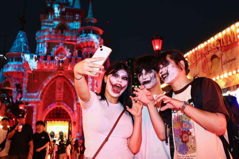 분장실과 의상실도 축제 기간 특수를 누린다. 분장실(1만~3만원)에서 여성은 ‘할리퀸’, 남성은 해골 변장법이 대세란다. 먹거리 중에는 혈액백 모양의 핏빛 음료 ‘블러드에이드(7500원·딸기맛)’가 베스트셀러다. 의상실에선 교복과 함께 저승사자 복장(2만5000원)이 인기다. ‘케이팝 데몬 헌터스’의 영향으로 ‘저승사자 보이즈’라는 별명까지 생겼다.