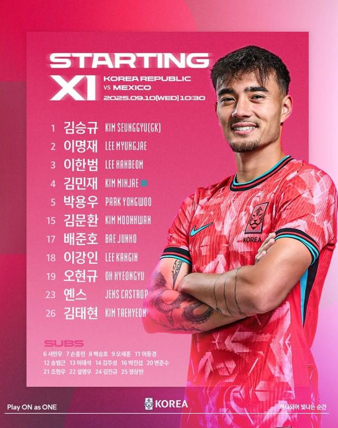 파격 또 파격이었다. 홍 감독은 미국전 베스트11과 비교해 '수비라인의 리더' 김민재(29·바이에른 뮌헨) 이한범(23·미트윌란)을 제외하고 9명을 교체했다. 손흥민도 예외는 아니었다. 오현규(24·헹크)가 원톱에 위치했다. 측면에는 이강인(24·파리생제르맹)과 배준호(22·스토크시티)가 배치됐다. 공격 옵션은 더 풍성해졌다. 미국전에서 '원톱 시대'를 다시 연 손흥민은 멕시코전에선 후반 시작과 함께 조커로 투입됐다. 주 포지션인 왼쪽 윙어 자리에 포진했다.