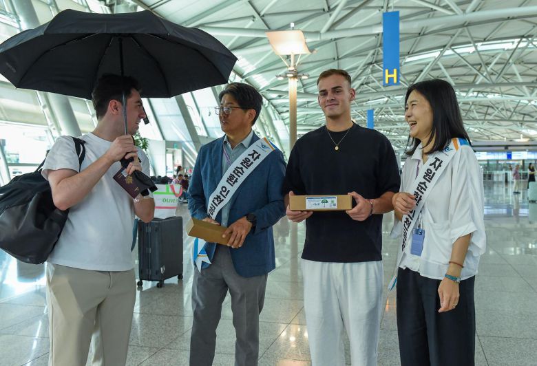 인천국제공항공사 직원들이 5일 제1여객터미널 3층 출국장에서 외국인 여객에게 페트병을 재활용해 만든 업사이클링 우산을 나눠주고 있다. 인천공항공사 제공