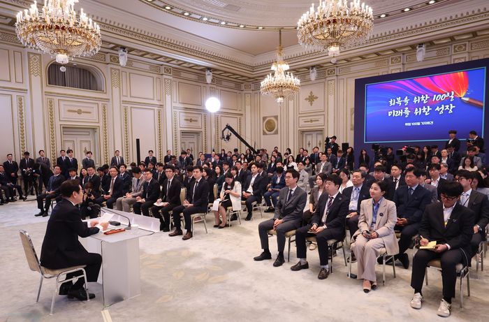 11일 이 대통령은 청와대 영빈관에서 ‘회복을 위한 100일, 미래를 위한 성장’이라는 주제로 기자회견을 진행했다. 내·외신 기자 150여명이 참석한 회견은 △더 나은 경제 △더 자주 소통 △더 큰 통합이라는 3가지 콘셉트로 꾸려졌다.