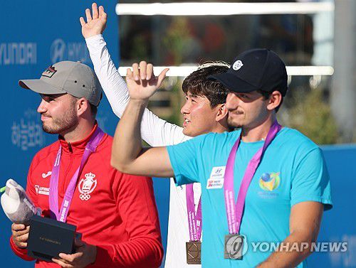 (광주=연합뉴스) 김성민 기자 = 11일 광주 동구 국립아시아문화전당 5·18민주광장에서 열린 2025 세계양궁선수권대회 리커브 남자 개인 시상식에서 선수들이 경기장을 나서고 있다. 왼쪽부터 스페인 안드레스 테미뇨, 한국 김제덕, 브라질 마르쿠스 달메이다. 2025.9.11