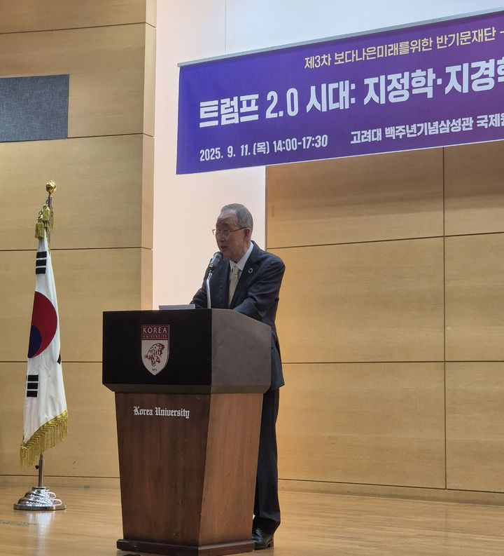 [서울=뉴시스] 이명동 기자 = 반기문 전 유엔 사무총장이 11일 오후 서울 성북구 고려대 백주년기념삼성관 국제원격회의실에서 열린 트럼프 2.0 시대의 안보·경제 전략 모색 제3차 공동 심포지엄에 참석해 기조연설을 하고 있다. 2025.09.11. ddingdong@newsis.com *재판매 및 DB 금지 |
