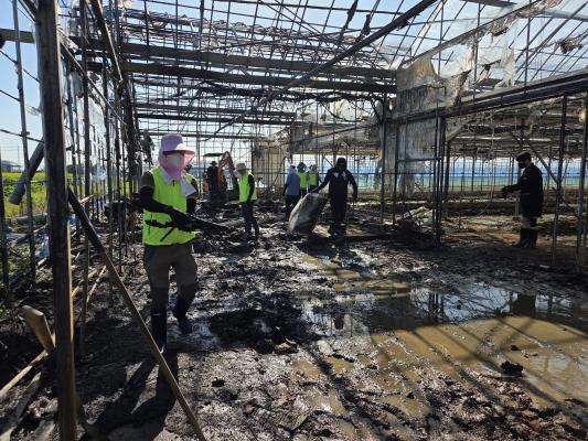 ▲전북농협 임직원들이 기록적인 집중호우로 큰 피해를 입은 군산 농가를 찾아 하우스 내 잔해물을 치우고 있다. ⓒ전북농협