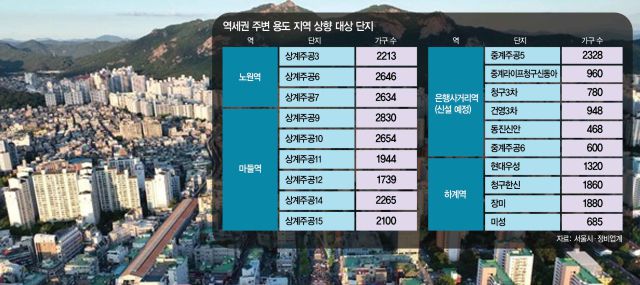 서울시는 전철역 반경 250m 이내와 준주거·상업지역 근처를 복합 정비 구역의 기준으로 삼았다. 이에 따라 노원역과 7호선 마들역, 하계역, 2027년 개통 예정인 경전철 동북선 은행사거리역 주변 단지들이 수혜를 입을 것으로 보인다. 구체적으로 상계주공3·6·7·9·10·11·12·14·15단지와 중계주공5·6단지, 청구3차, 건영3차, 중계라이프청구신동아 등 19개 단지, 총 3만 2000여 가구가 대상이 된다. 서울시는 복합 정비 구역의 19개 단지를 포함한 재정비안 대상지의 전체 58개 아파트 단지 7만 6000여 가구가 재건축을 통해 10만 3000여 가구로 늘어날 것으로 추산하고 있다.
