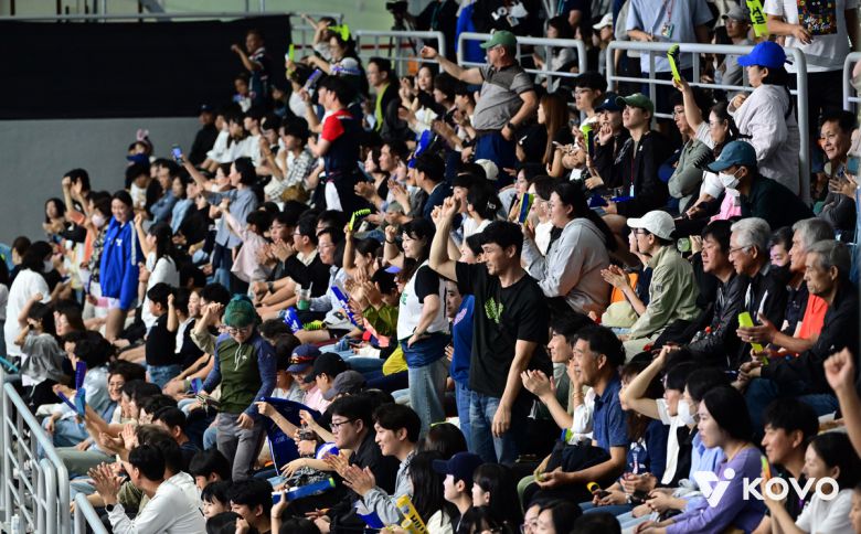 2025 여수·NH농협컵 프로배구대회가 여수에서 처음으로 열린다. 배구팬들이 2024 KOVO 컵대회 IBK기업은행과 현대건설의 준결승에서 열정적으로 응원하고 있다. 사진=KOVO 제공 |
