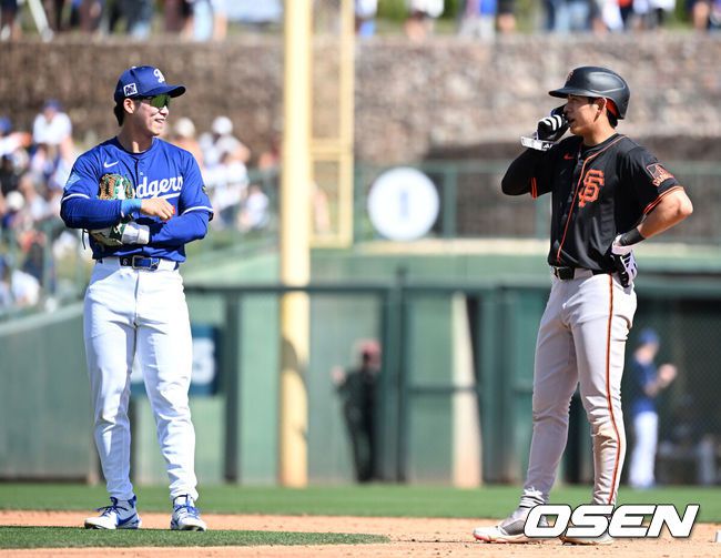 [OSEN=글렌데일(미국), 이대선 기자] 이정후(샌프란시스코 자이언츠)와 김혜성(LA 다저스)이 맞대결에서 나란히 맹활약했다. LA 다저스와 샌프란시스코 자이언츠는 2일(이하 한국시간) 미국 애리조나주 글렌데일의 캐멀백 랜치에서 2025 메이저리그 시범경기를 치렀다.이날 김혜성은 8번 유격수로,이정후는 3번 중견수로 각각 선발 출장했다. 이정후가 총알 2루타로 선제 타점을 올리자, 김혜성은 시범경기 첫 홈런포를 터뜨렸다. 3회초 2사 만루에서 LA 다저스 김혜성과 2루에 안착한 샌프란시스코 자이언츠 이정후가 이야기를 나누고 있다. 2025.03.02 / sunday@osen.co.kr