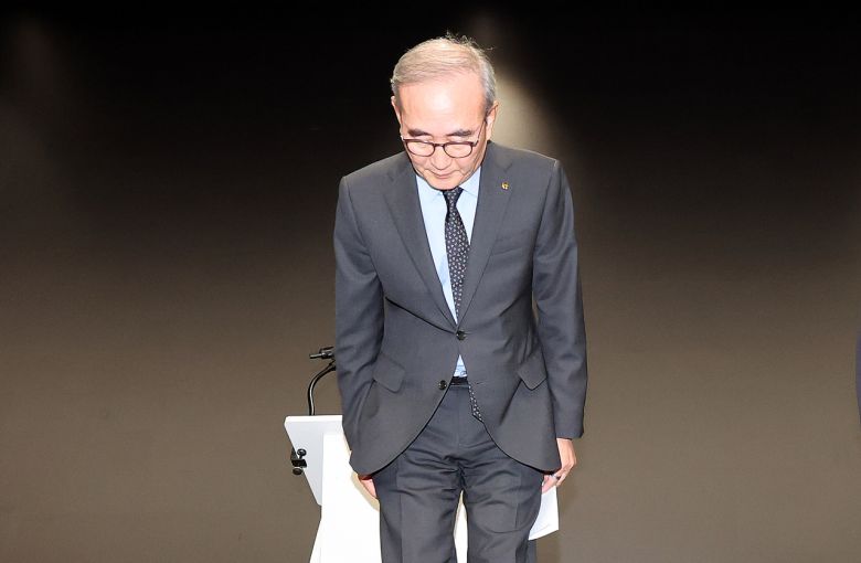 김영섭 KT 대표가 지난 11일 서울 종로구 KT 광화문빌딩 웨스트 사옥에서 소액 결제 피해와 관련해 고개 숙여 사과하고 있다. [연합] |