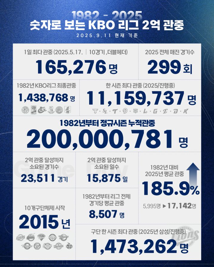 KBO 리그는 출범 첫 해인 1982년부터 지난 해까지 치러진 정규시즌 2만 2,860경기에서 누적 1억 8천 884만 1,044명으로 2억 관중 달성까지 1천115만 8,956명을 남겨두고 2025 시즌을 맞이했다. 전날인 11일까지 1천115만9,737명의 관중이 입장하며 정규시즌 누적 2억 781명을 기록했다.