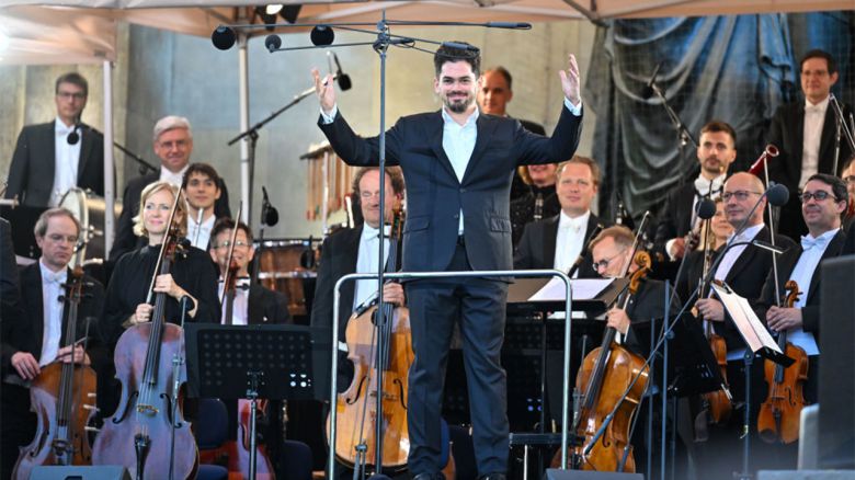 ▲ 2024년 7월 13일 독일 뮌헨에서 열린 리셉션 무대에 이스라엘 지휘자 라하브 샤니가 서 있다.