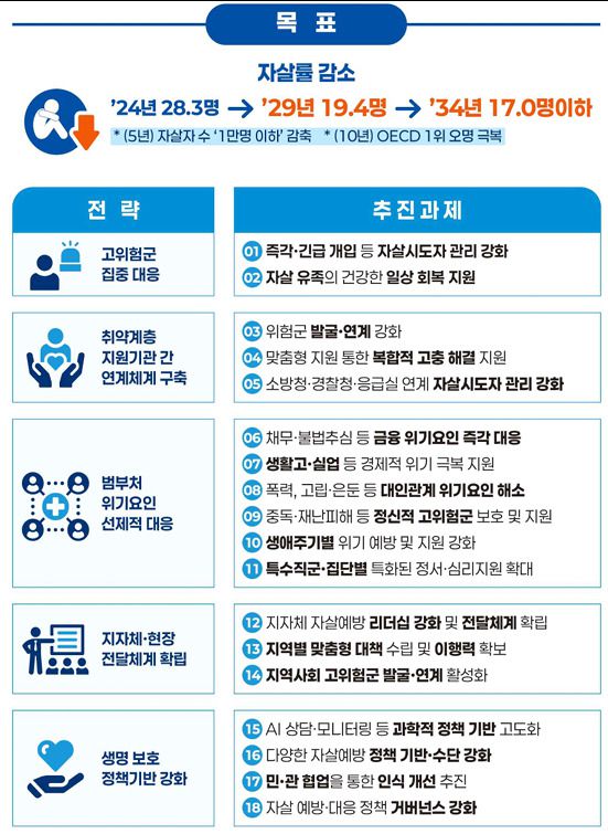 정부는 12일 김민석 국무총리 주재로 열린 제9차 자살예방정책위원회에서 '2025 국가자살예방전략'을 발표하고, 5년 안에 자살자 수를 1만명 이하로 감축하겠다는 청사진을 제시했다. 이후 대책을 지속 추진해 10년 내로는 OECD 1위 수준에서 벗어나겠다는 방침이다.