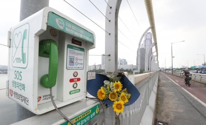 서울 마포대교에 설치된 생명의 전화 옆에 꽃다발이 놓여져 있다. 뉴스1 |