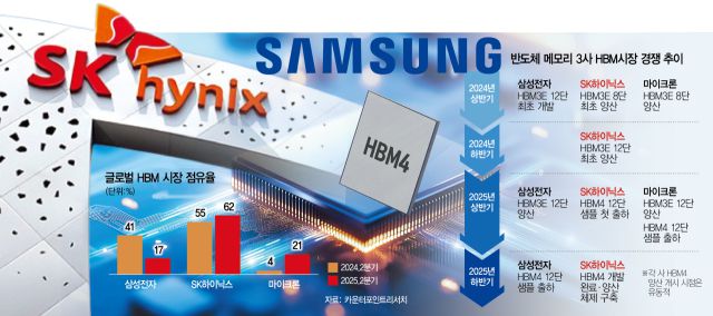 삼성전자가 본격적으로 HBM4 시장에 진입하면 SK하이닉스가 독주하던 HBM 시장점유율 판도에도 변화가 생길 것으로 전망된다. 마이크론도 6월 주요 고객사에 HBM4 샘플을 납품한 후 양산 체제를 구축하고 있어 연내 시장 진입이 예상된다. 시장조사 업체 카운터포인트리서치에 따르면 올해 2분기 HBM 시장점유율은 SK하이닉스가 62%로 1위였고 마이크론 21%, 삼성전자 17% 순으로 뒤를 이었다.